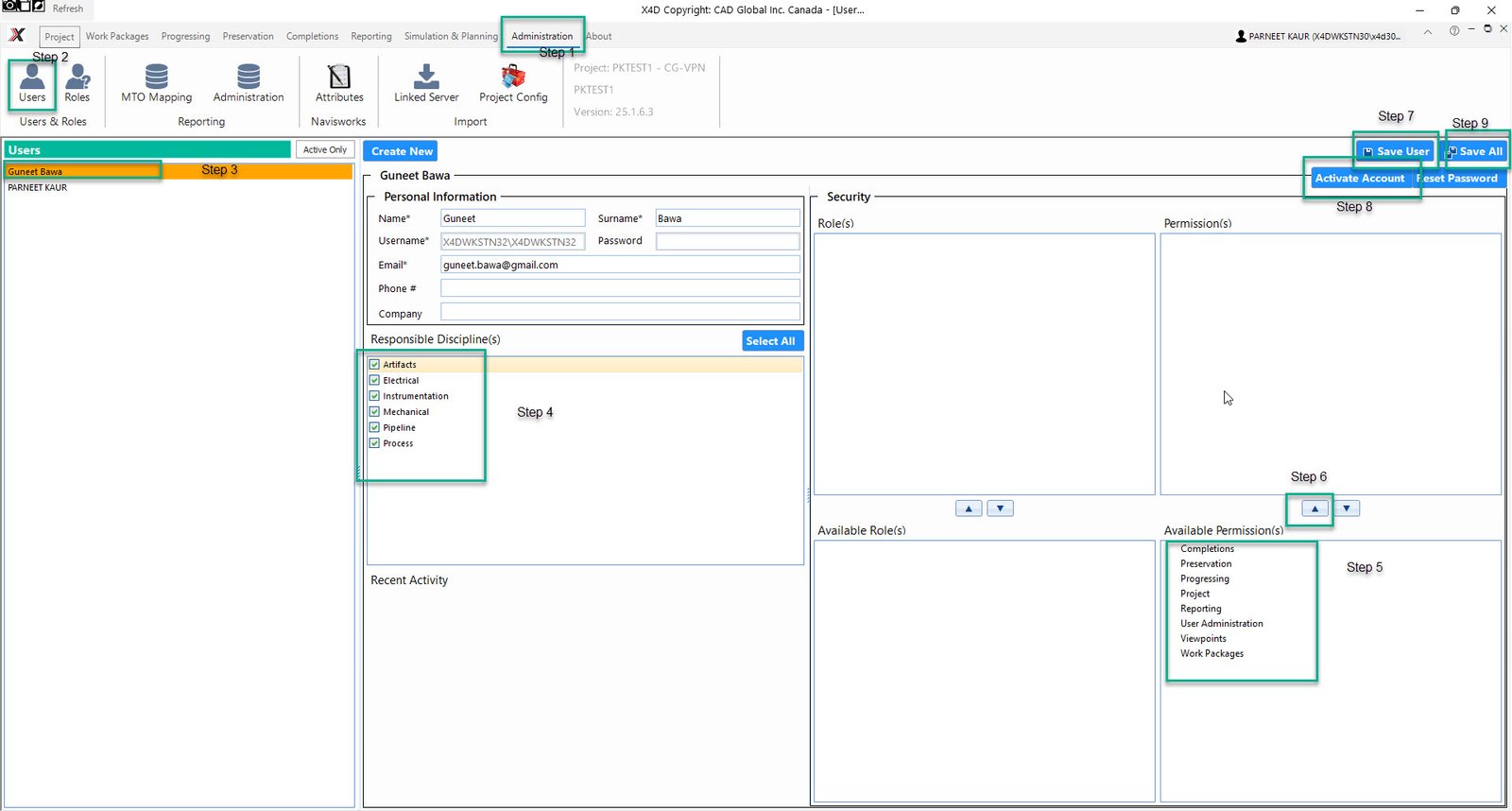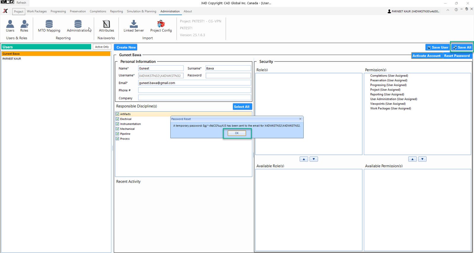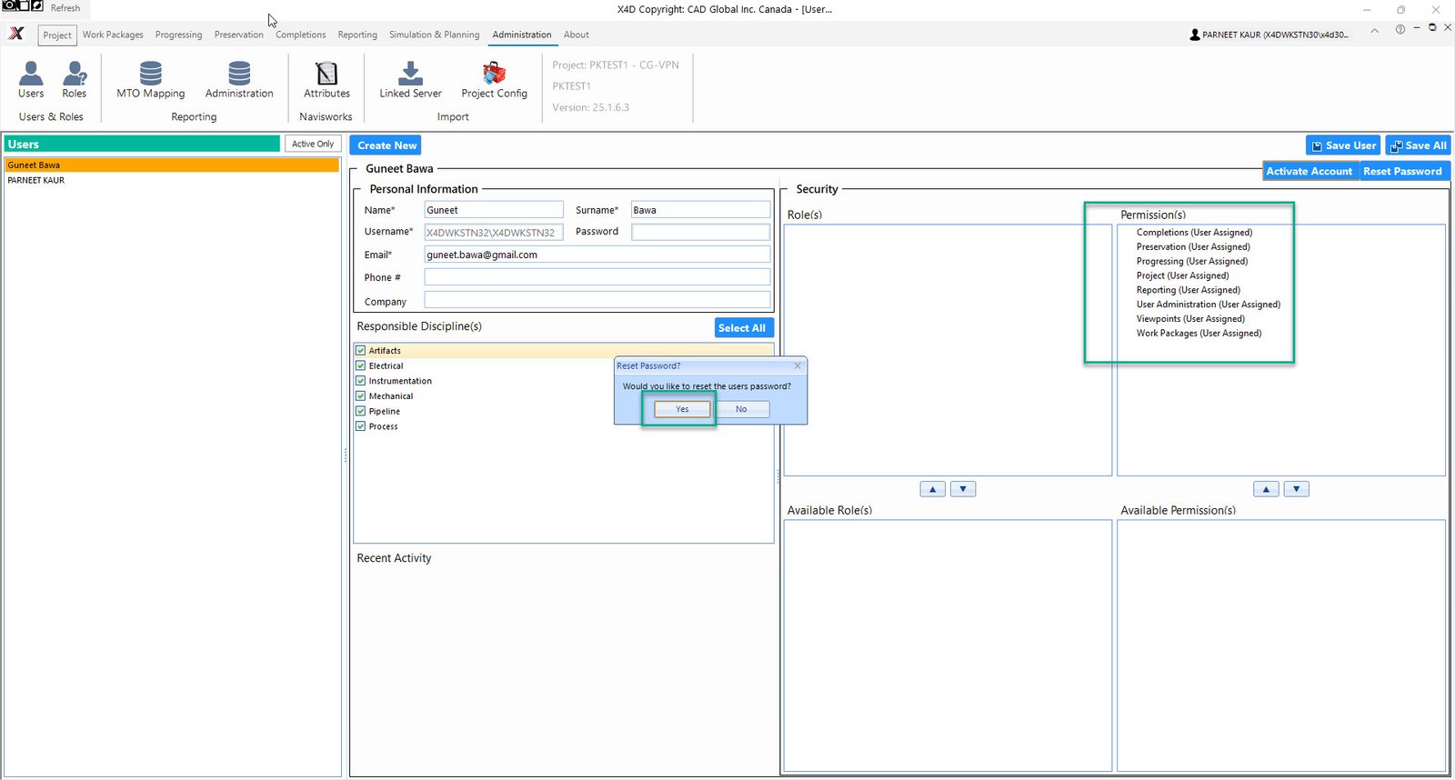 •Click on Save User and then hit Activate Account, this would pop up a prompt to reset the users password, click Yes.