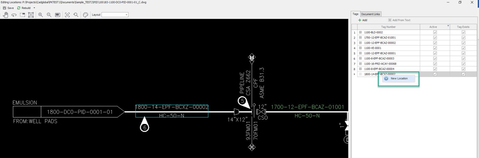 •Once the missing tag in the drawing is selected, right click on the tag number in the tag list and click "+ New Location"