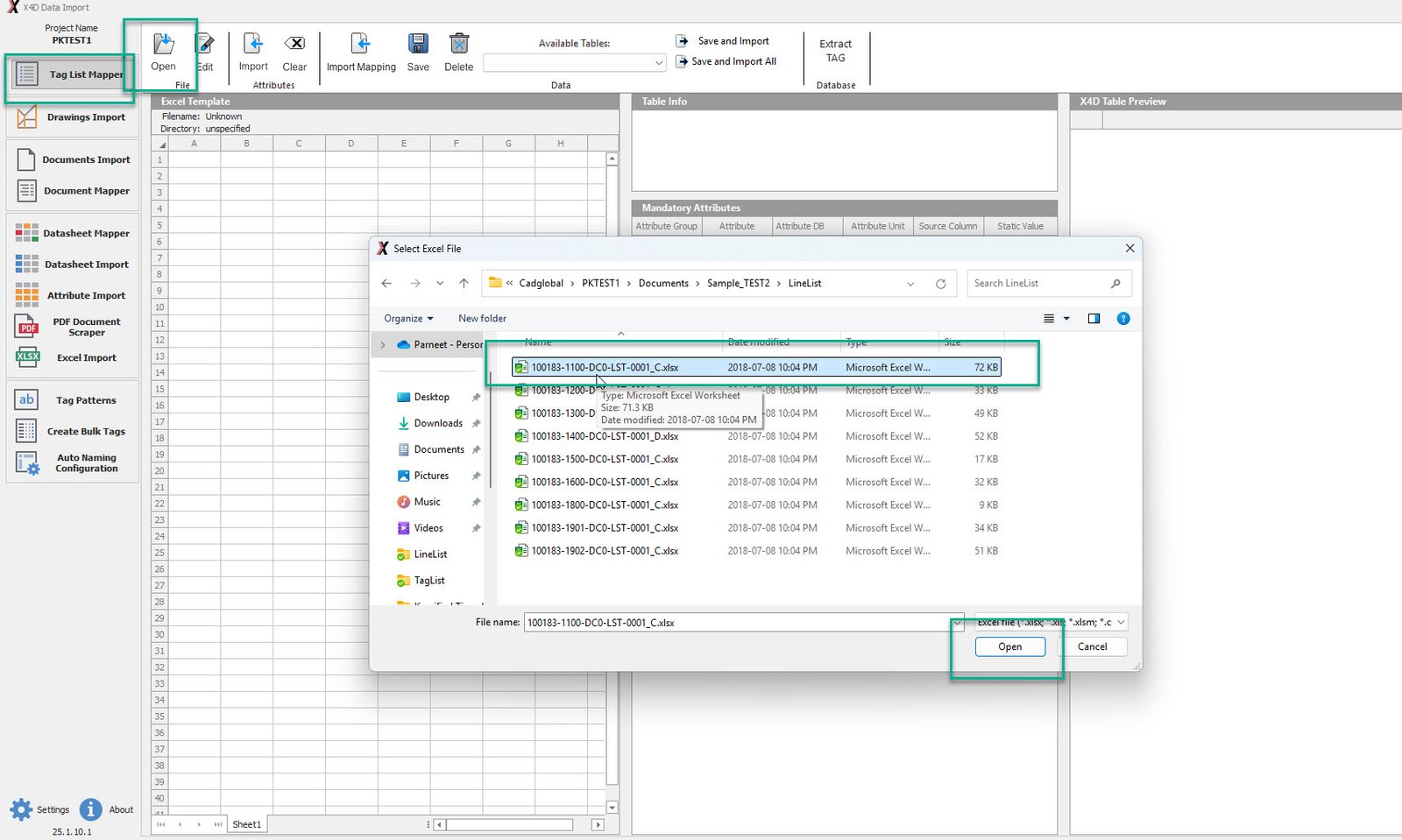 •Select the .xlsx file from the LineList and Click "Open"