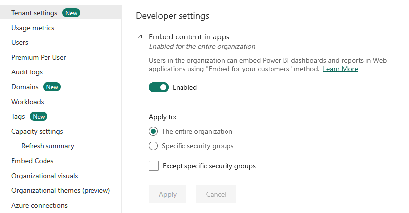 2. Enable embedding in Tenant Settings.