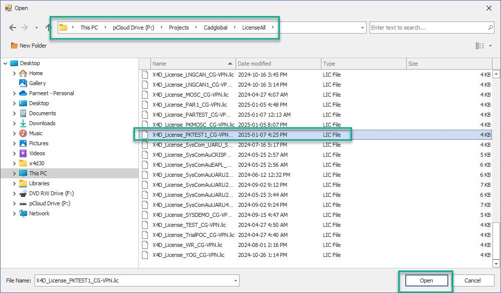 •Select the X4D License of your Project from the following path P:\Projects\Cadglobal\LicenseAll and click Open.