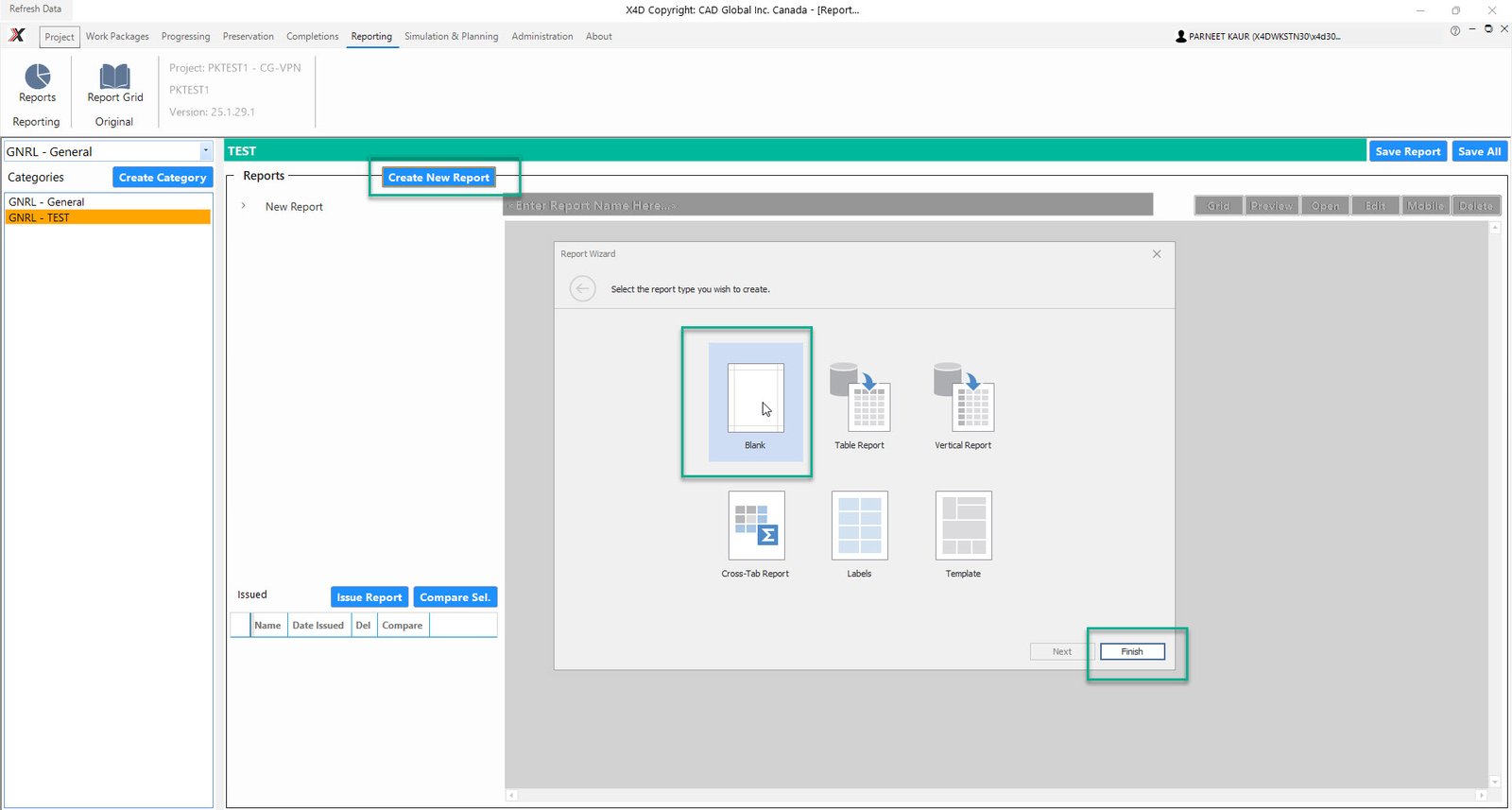 •Click on Create New Report, this should pop up the Report Wizard Window. Choose the report type that is to be created and Click Finish.