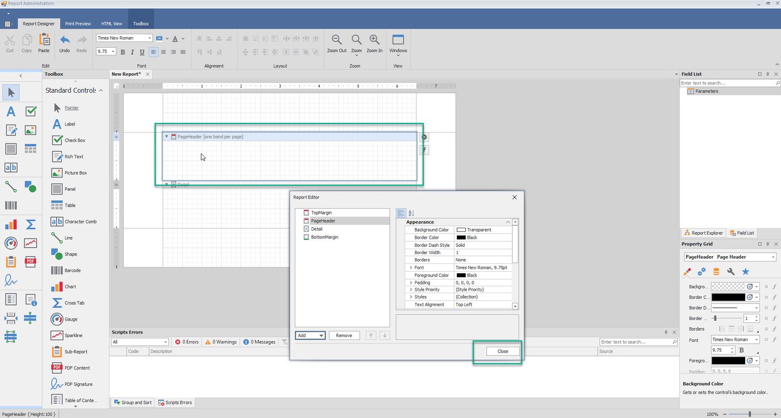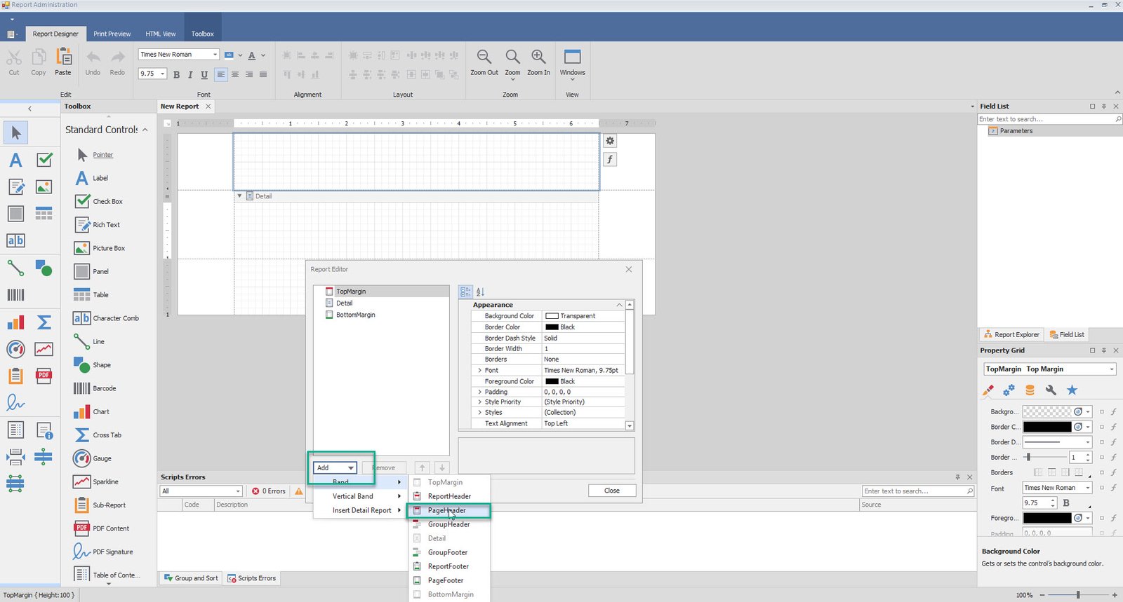 •Click on the Add button, to make the necessary details such as the Page Header, Page footer, etc